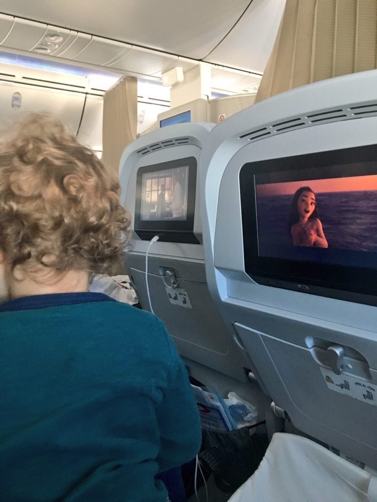 Questo era il primissimo volo in cui Giulio (2 anni e 4 mesi) viaggiava da adulto e non più da infant. Questo vuol dire un sedile tutto per sé, un pasto tutto per sé e anche intrattenimento a bordo da grande. Per quanto riguarda l’intrattenimento, devo dire che tutti e tre ci siamo goduti film e cartoni per buona parte del volo, con delle piccole (più o meno piccole) pennichelle tra un film e l’altro, anzi tra un continente e l’altro!