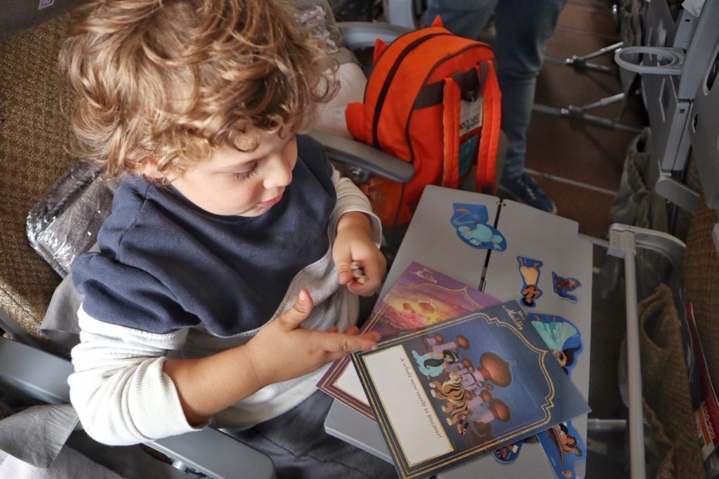 Appena saliti a bordo, oltre alla classe business le famiglie sono le prime a salire a bordo, siamo stati accolti da un’hostess gentilissima che ci ha portato un kit da gioco dedicato al cartone Disney Aladdin. Ma non è tutto. Dopo il passaggio della hostess con il tipico panno caldo asiatico per lavarsi le mani, è iniziato il servizio del pasto di cui parlerò meglio dopo.