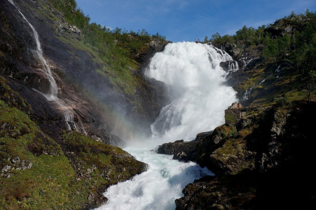 Amo i treni e amo profondamente la Norvegia… quindi ho amato anche questo tragitto? Purtroppo no, per nulla. Non so se la situazione sia cambiata ma ricordo un treno finto, kitsch, con l’altoparlante che gracchiava in continuazione informazioni che sapevamo già impedendoci di perderci un po’ nel paesaggio. Poi lo stop assurdo davanti alla cascata dove ci fecero assistere a un’assurda danza con musiche e attrici che impersonavano lo spirito dell’acqua.