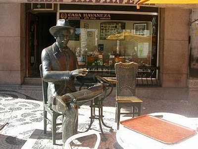 Seduto, in completa solitudine, con la mano poggiata su uno di questi tavolini, troverete un uomo bronzeo dal grande cilindro sulla testa, una gamba accavallata sull’altra e lo sguardo basso, assorto e contemplativo, inquieto. L’uomo in questione è Fernando Pessoa, il “poeta di Lisbona”, l’artista che più di tutti è riuscito ad incarnare lo spirito di questa città così bella che “Non ci sono per me fiori che siano pari al cromatismo di Lisbona sotto il sole”.