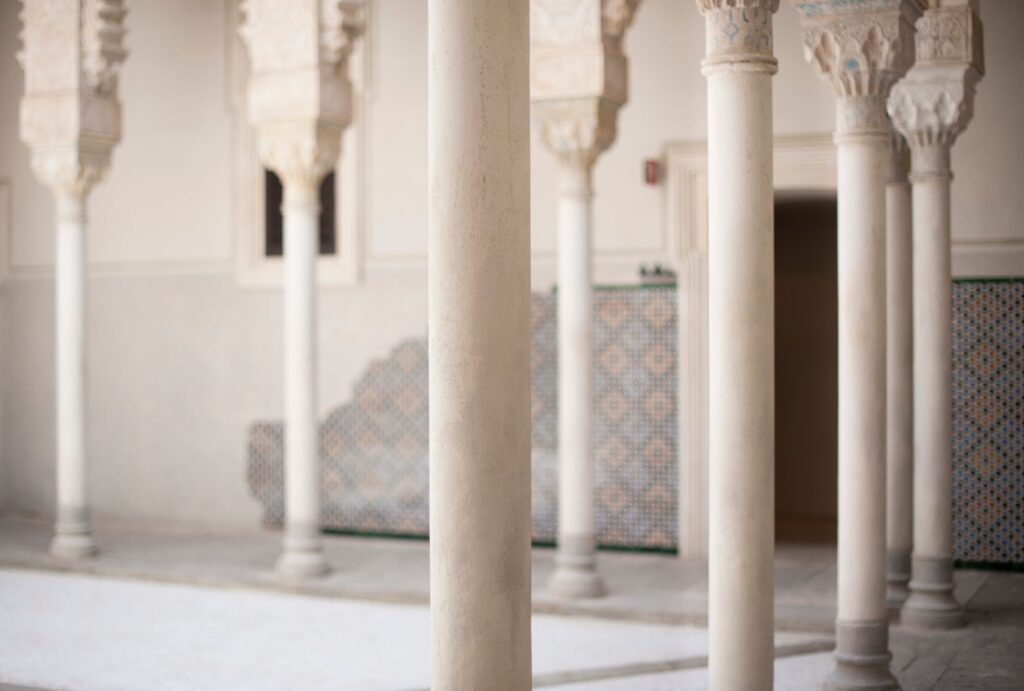 Il gioco di archi nel soffitto nella cappella che è ispirata alla grande Moschea di Cordova, ma ricorda tanto le decorazioni in marmo bianco e nero delle cattedrali italiane. In realtà, avvicinandosi agli archi si scopre l’inganno: si tratta di legno dipinto che imita il ben più costoso materiale. Mentre l’apparente intarsio del soffitto… si tratta solo quadrati di stoffa, dipinta a mano!