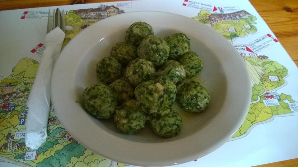 Alle 10 ci incamminiamo di nuovo verso il rifugio Pernici e dopo aver messo i panni bagnati ad asciugare decidiamo di rispettare il programma del blogtour nonostante la pioggia. Ed è così che ci incamminiamo lungo i sentieri che portano lungo alcune trincee della Grande Guerra. Quello che colpisce non è solo una natura splendida ed un panorama mozzafiato, ma è anche l’architettura dei piccoli bunker militari scavati letteralmente nella roccia. Lungo le creste delle montagne che ci circondano se ne trovano a centinaia e gli appassionati del trekking storico a mio avviso devono fare un salto in queste zone. Ritornati al rifugio il tempo ci concede una tregua e torniamo a tavola. Questa volta ci concediamo giusto un piatto di Strangolapreti, piatto tipico davvero delizioso di grandi gnocchi con pane raffermo fatto riposare nel latte, poi spinaci, uova, Trentin grana e saltato nel burro.