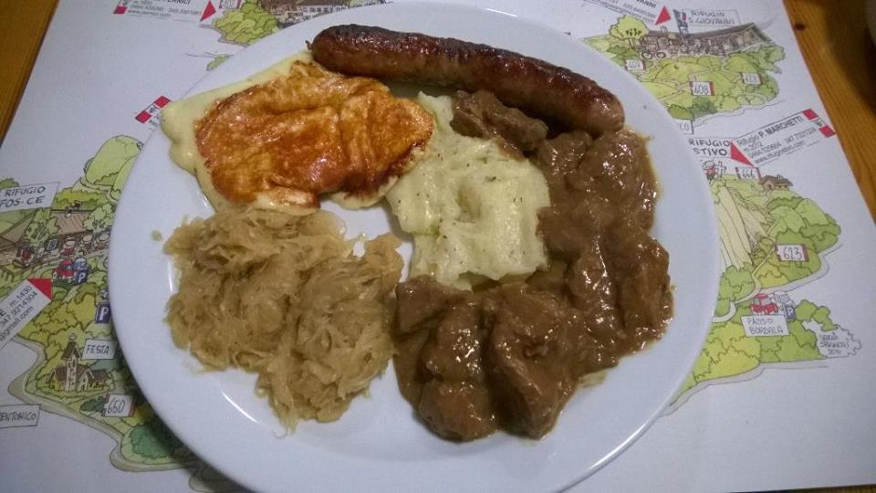 Dopo aver guardato le tante foto incorniciate ed osservato i numerosi reperti della Grande Guerra appesi qua e la per il salone è arrivato il momento di metterci tutti a tavola. All’interno del rifugio è possibile infatti assaporare l’ottima cucina trentina ed è così che in un’attimo troviamo la nostra tavola imbandita di salumi e formaggi tipici, la famosa polenta di patate della Valle di Ledro, poi crauti, goulash e vino trentino. Immancabili a fine pasto le grappe, tutte rigorosamente fatte in casa.