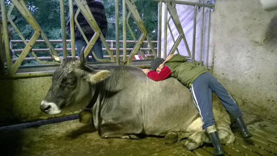 Naturalmente dopo cena cosa vuoi fare se non stare a fianco della stufa accesa e chiacchierare con un bicchier di grappa in mano? E così facciamo fino a quando non è arrivato il momento di andare a letto anche perché la sveglia è puntata alle 4.30. All’alba siamo già tutti in piedi e grazie al pickup di Marco, il gestore del rifugio, raggiungiamo Malga Trat. Stefania, la guida che ci accompagnava era molto preoccupata che i turisti prenotati non si sarebbero presentati visto il tempo da lupi. Ed invece quasi trenta persone, nonostante la pioggia battente, hanno partecipato alla fase della mungitura, al momento del trasferimento del latte nel vicino caseificio fino alla colazione. Un successo. La cosa che più ci ha stupito è stato incontrare dei giovanissimi che gestiscono le attività della malga assieme alla famiglia. Stefania. 21 anni, nelle stalle segue la mungitura assieme al fratello più piccolo Gabriele, 7 anni. Matteo, 18 anni, si occupa invece con sapienza del caseificio.