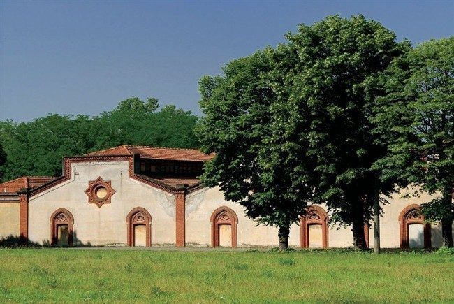 Il sito è dominato dagli imponenti capannoni dell’opificio tessile, cuore pulsante del villaggio, costruiti in mattoni con graziose decorazioni in cotto e eleganti bifore gotiche. Colpisce l’ingresso della fabbrica, dove un altissimo camino in mattino svetta tra le due ali di edifici neogotici degli uffici dirigenziali, ravvivati da i colori pastello delle decorazioni architettoniche.