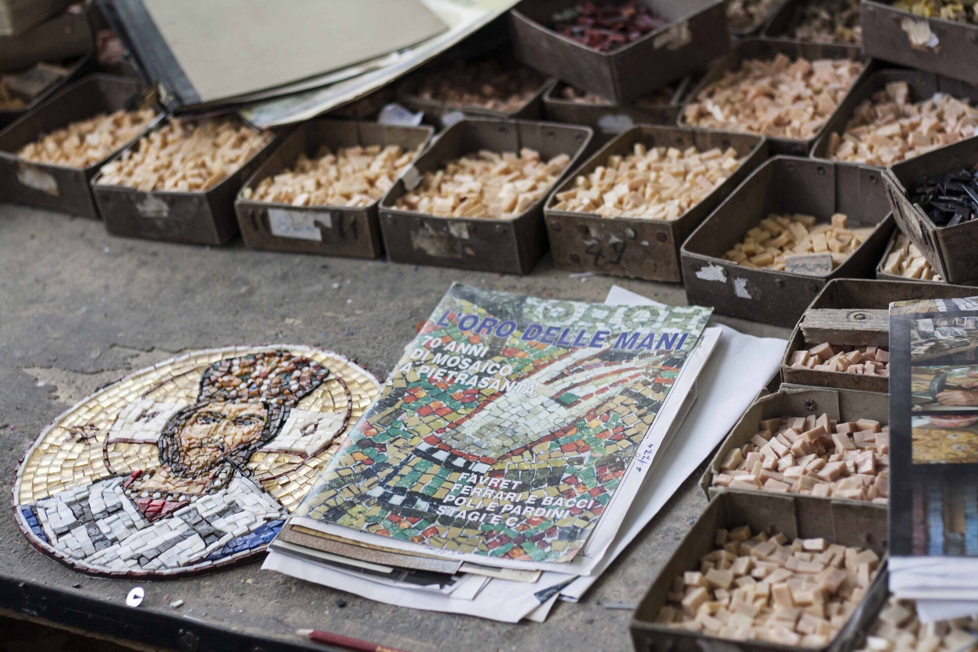 Incontriamo poi due dei più esperti e richiesti mosaicisti del mondo, Piero Giannoni e Alberto Da Prato, che creano bellissimi arabeschi, minuziose decorazioni e ritratti per personaggi importanti. Ci mostrano la foto della consegna del ritratto musivo a Papa Francesco. Sui tavoli e su ogni scaffale si trovano migliaia di quadratini colorati, ognuno suddiviso a seconda della sfumatura di colore e della grandezza. Ci dicono di collaborare con il programma per bambini del Parco della Versiliana. Pur dopo aver spedito nel mondo le loro creazioni, vanno e insegnano l’arte ai bambini.