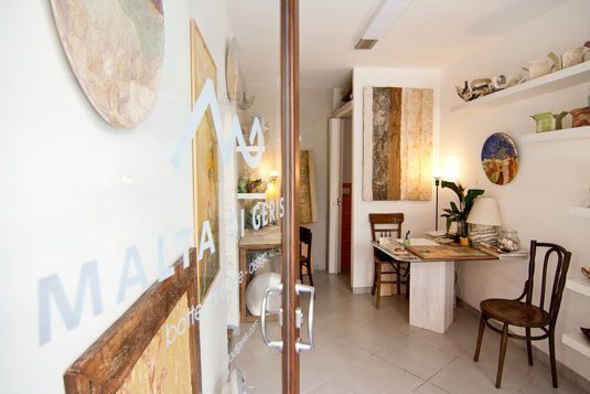 Uscendo dal Teatro Margherita e inoltrandovi nella Bari vecchia dalla sopra citata Piazza del Ferrarese, proseguendo a sinistra vi è Piazza Mercantile dove imboccando sempre una strada laterale vi è la Via Fragigena. Fermandovi al civico 11 potete fare una visita all’atelier artigianale Malta di Geris, spazio dell’artista Maria Pierno, una signora molto affabile e gentile che sarà lieta di aprire la porta della sua casa-bottega di arte e design mostrandovi le sue speciali creazioni, che sono tra l’altro anche acquistabili: vasi, statue, lampade, pannelli decorativi, tavoli, e altri oggetti raffinati. Tutti modellati con Malta di Geris, un composto eco-compatibile creato e sperimentato dalla stessa Pierno. Vi si può accedere il pomeriggio dalle 18 alle 20 o anche la mattina su appuntamento.