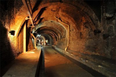 Grazie ad un processo di decantazione l’acqua usciva depurata. Sempre a questo livello superiore, si trovano una serie di cunicoli, oggi visitabili; all’interno di uno di questi si trova un’incredibile incrostazione calcarea che brilla, probabilmente lì da secoli.