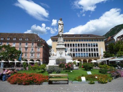 Iniziamo il nostro giro a piedi dal cuore del centro storico: Piazza Walther. Una grande piazza con al centro la statua del poeta trovatore Walther von der Vogelweide e sulla quale si affacciano caffè, negozi ed hotel.