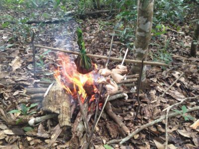 Abbiamo pranzato nel bel mezzo della giungla, sedute a terra con dell’ottimo pollo cotto sul fuoco che P aveva acceso con dei ramoscelli e una squisita zuppa di funghi che aveva preparato all’interno di una foglia di banano… mai visto nulla di simile!