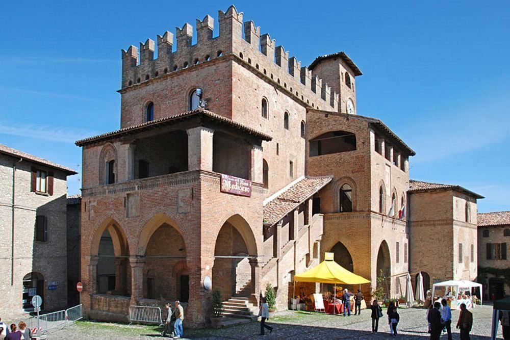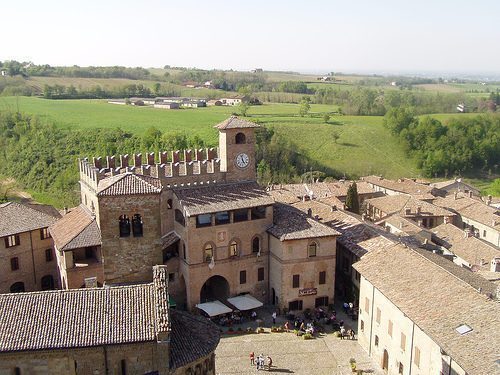 Un altro piccolo borgo dall’incredibile unicità è quello medievale che si erge attorno al Castello di Vigoleno. Si trova isolato sulle colline, ci si arriva dopo una buona mezzora di irte salite, tornanti che neanche fossero le Alpi, villette nuove e pascoli a perdita d’occhio. La strada ascende stretta, ma ben presto si capisce che nulla impedisce a turisti, ciclisti e ottimi scarpinatori di arrivarci, nessun deterrente a sì tanta bellezza. La piazzetta che si apre davanti all’unico accesso al castello è di recente costruzione e illustra la storia del borgo fortificato e la sua importanza per i pellegrini diretti a Roma, quale luogo posto lungo la Via Francigena. Qui una fontanella, panchine e la mappa del cammino aiutano all’orientamento lungo la lunga via. Accogliente.