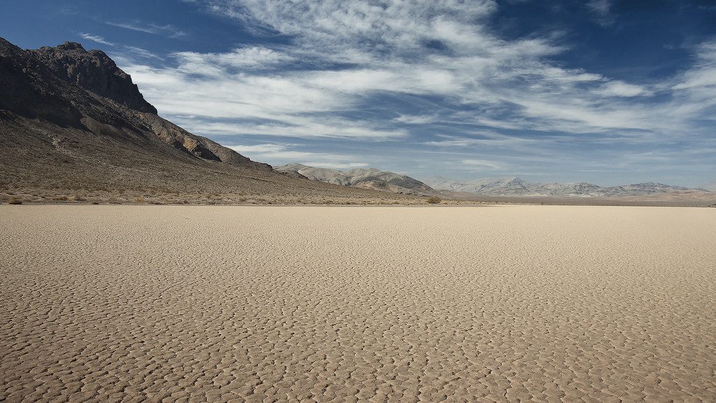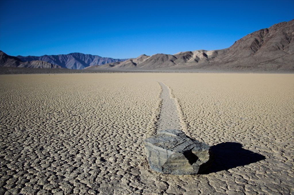 Superato l’Ubehebe Crater comincia la pista sterrata che va in direzione sud- sudovest per circa 42 km (26,5 miglia) fino a portarci alla Racetrack Playa. Si tratta di una distesa di sabbia dove si può osservare il curioso fenomeno delle rocce che camminano lasciando vistosi segni del loro percorso che non è solo in linea retta, come tutti potremmo pensare, ma effettua deviazioni improvvise, torna indietro, poi riparte in avanti oppure in ogni altra direzione lasciando sconcertati dal comportamento di queste piccole pietre così come degli enormi massi che sembrano essere mossi da qualche forza sconosciuta.