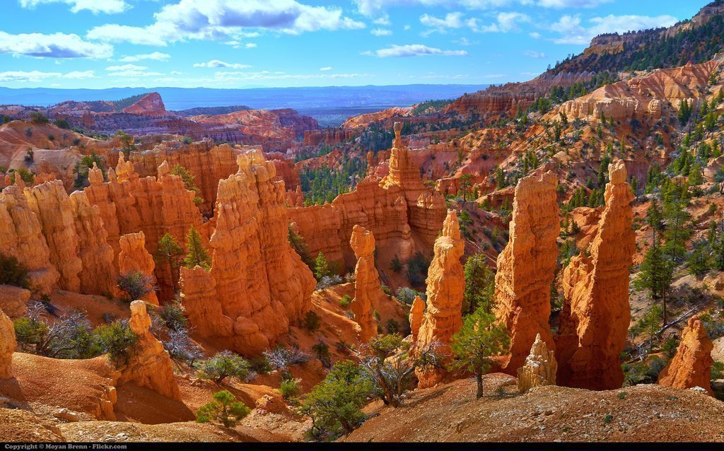 Il Bryce Canyon si trova a nord del Grand Canyon, siamo dentro i confini dello Stato dello Utah, in una posizione piuttosto isolata tanto che da Page sono necessari 300 km di strada con molte curve il che significa oltre 5 ore di auto. Lo spettacolo è grandioso; con tutti i pinnacoli e gli intricatissimi disegni formati dall’acqua che ha eroso le rocce che qui assumono una colorazione che va dal giallo al rosso.