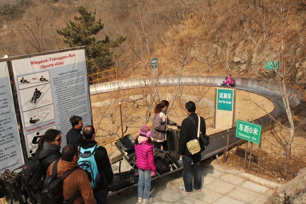 Scendere è molto più semplice, tuttavia potreste voler tentare l’avventura di una discesa molto più divertente e spericolata. A Mutianyu, per scendere a valle dalla Grande Muraglia, è possibile prendere il Toboga, un enorme scivolo tortuoso che arriva fino in fondo alla valle percorrendo la stessa distanza percorsa da seggiovia e cabinovia. Si scende con una sorta di slittino, che ha un freno manuale controllabile durante la discesa, così da poter decidere a che velocità scivolare. Ci sono delle persone durante il percorso che fanno si che non si blocchi mai il flusso di gente che scivola, e questo è molto utile, perché dalla seggiovia salendo è facile vedere persone spaventate che tirano il freno al massimo per andare piano ma rischiano di bloccare chi viene dopo di loro!