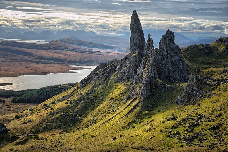 Spostiamoci ora nella penisola di Trotternish, dove troverete il paesaggi più belli di Skye (e forse della Scozia). Da Portree parte una strada ad anello che percorre la penisola e lungo la quale potrete ammirare, percorrendola in senso antiorario, l’Old Man of Storr, il Kilt Rock, il Quiraing, il Duntulum Castle e il Faerie Glen. L’Old Mann of Storr è un pinnacolo roccioso la cui base è raggiungibile a piedi dal parcheggio (circa 5 km andata e ritorno); unica nota negativa di questo posto visitato ad agosto è stato l’assalto dei moscerini (purtroppo presenti comunque anche in altri posti, ma qui in modo particolare), munitevi di spray repellenti o ancora meglio di retine da mettere in testa, si è vero può far ridere ma vedrete molta gente indossarli e così saprete il perché.