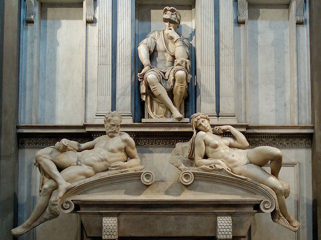 La Sagrestia Nuova contiene i monumenti sepolcrali dei Medici, realizzate da Michelangelo per onorare la dinastia dei principi della sua città. Il Buonarroti usa il suo genio e rappresenta i Medici con allegorie dei momenti della giornata: Giorno, Notte, Aurora e Crepuscolo.
