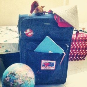 “Il mio valigione blu che è in viaggio con me dal 2007 e ne ha viste davvero di tutti i colori! :-p Special guests: l’orsetto natalizio “fesh” – appeso lì dal natale 2007, è rimasta soltanto la testa – il mappamondo gonfiabile – e il mio nuovo cappello vietnamita!”