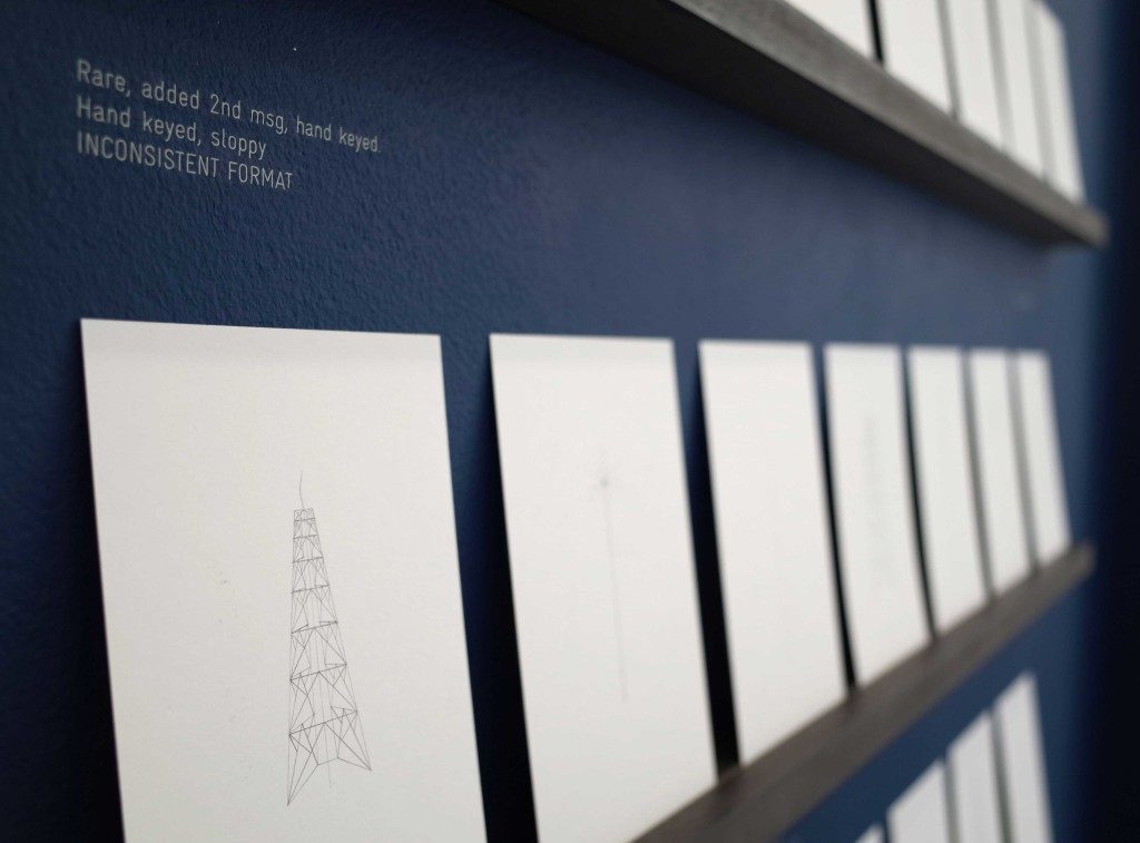 Giovanna e Phil mi hanno spiegato che sono loro stessi a dipingere le pareti della galleria con colori diversi, a seconda delle esposizioni e delle opere che saranno installate. C’è anche una parete bianca per le proiezioni video, comunque. Io ho avuto la fortuna di capitare nel turno della parete blu-profondo-petrolio-carta da zucchero e non so che altro per definirla. Fatto sta che la parete, con quei piccoli cartoncini appoggiati sopra come carte da gioco, era già di per sé un’opera d’arte. Con quel suo stagliarsi sul bianco abbacinante (me lo immagino così, di giorno, sebbene io l’abbia visto di sera) delle pareti, beh, che dire… Wow. A coronare la bellezza di questo interno, un vaso di lilium orientali, color vinaccia, che, insieme a quella particolare tonalità di blu, riconducono la stanza all’epoca Liberty (Modern Style, in UK).