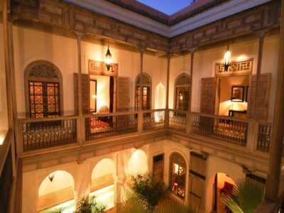 Arrivati all’ingresso c’è soltanto un portone super-elaborato, scolpito nel legno. Una volta aperto si entra in una dimensione differente dalla caotica Marrakech. Il nostro riad si chiama Dar Al Kounouz. È incredibile come cambino i suoni ed i rumori da fuori la porta a dentro. Prima il caos, le voci, i profumi speziati e poi il silenzio, i colori sgargianti delle lanterne marocchine posizionate ovunque e l’intenso profumo di the alla menta che viene servito a tutte le ore con giochi abili di versamento.