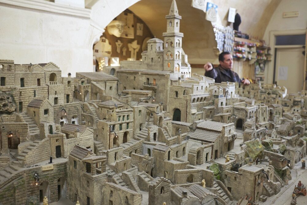 Durante la mia giornata a Matera, non ho potuto vedere tutto, questo è certo, ma ho potuto scoprire qualche chicca che mi piacerebbe suggerirvi per un viaggio nella Città dei Sassi. Tra l’artigianato locale che secondo me non potete perdere, c’è Sassi in Miniatura, da cui vengono le opere che sono presenti nella foto sotto e nella foto di copertina del post. L’artista è Eustachio Rizzi che lavora nei locali di via fiorentini, 82 nel Sasso Barisano, nella foto qui sopra si può vedere il figlio. Un negozio unico, incredibilmente affascinante, non potrete uscire a mani vuote.