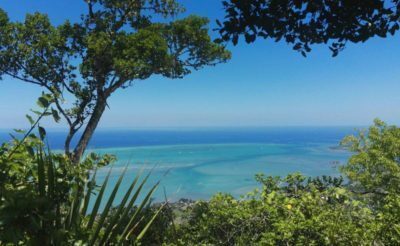 Il sentiero arriva sul picco (e dico picco) della montagna, nel punto più alto in assoluto a quasi 800 metri: un cerchio d’erba circondato da cespugli di quattro metri di diametro che offre un panorama mozzafiato su Le Morne, il suo mare turchese e sulle montagne lussureggianti intorno.