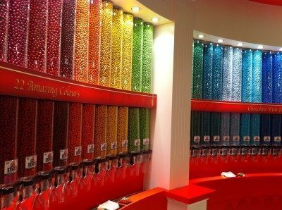 All’interno del grande negozio un tripudio di colori e un odore intensissimo di cioccolata che anche con la porta spalancata non se ne va. Al piano terra si trovano questi enormi contenitori, che vedete nella foto sopra, che servono per fare delle buste fai da te. Vuol dire che potete prendere dei sacchettini di plastica targati M&m’s e riempirli con i colori che volete. Dal rosso al bianco, bal blu al verde, oltre ai colori già mixati. Io ad esempio ho comprato il “colore UK” con i colori della bandiera inglese :)