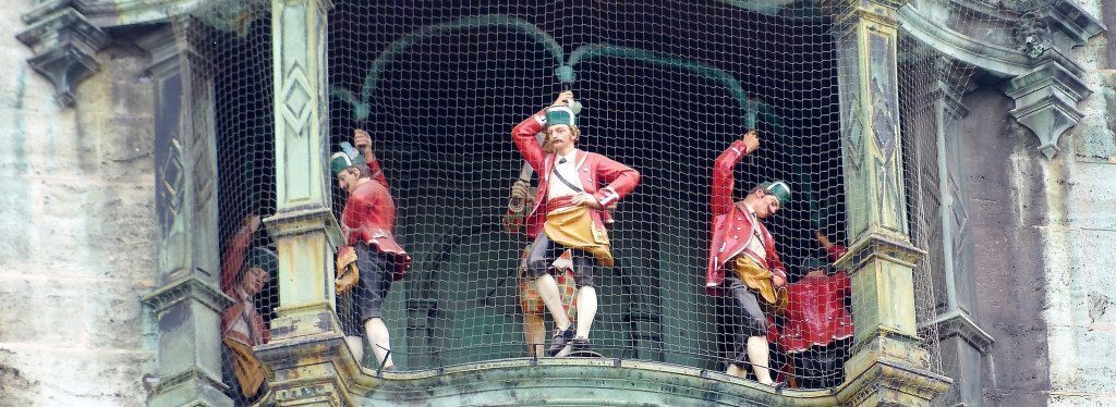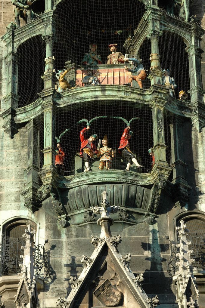 Spostandosi per Monaco in metropolitana, scendendo alla fermata di Marienplaz e riemergendo dalle profondità della metro, ci si ritrova direttamente di fronte al Glockenspiel. Alle ore 11, alle ore 12 e nei mesi da marzo ad ottobre anche alle 17, si può godere di uno spettacolo gratuito a cielo aperto unico al mondo. Il carillon è disposto su due piani e si aziona secondo un cerimoniale preciso. Prima suonano le campane che scandiscono l’ora, poi partono i personaggi del piano superiore che inscenano il matrimonio di Guglielmo V, successivamente quelli del piano inferiore con la danza dei bottai, terminando con il canto del gallo dorato, posto alla sommità del carillon, che muove la testa e sbatte le ali tre volte.
