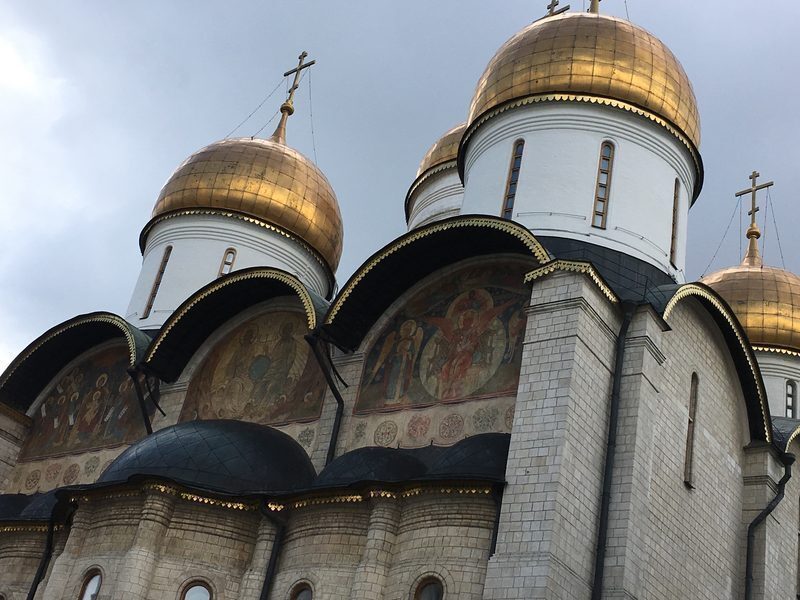 Per esigenze di tempo abbiamo scelto l’ingresso base che, dopo appena qualche minuto di attesa per i controlli di sicurezza, ci ha permesso di accedere alla piazza Sobornaya. Qui, su questi stessi ciottoli hanno camminato zar, dittatori e presidenti. Chi per entrare all’Arsenale, chi al Palazzato del Senato o all’edificio del Soviet Supremo, in stile neoclassico o, ancora, al moderno Palazzo di Stato costruito in vetro e cemento. Sulla stessa piazza si affacciano tre cattedrali: dell’Annunciazione, quella dell’Arcangelo e quella dell’Assunzione. Tre edifici di un bianco quasi abbagliante contro il grigio del cielo, caratterizzati dalle cupole dorate così diffuse in questa città.