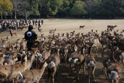 Scoperta dell’ultimo nostro viaggio: se avete un biscotto per cervi (si possono acquistare ad ogni angolo di strada) e tardate a darlo ai golosi animali, questi da bravi giapponesi si inchineranno per chiedervelo; attenzione però, se tardate troppo inizieranno ad inseguirvi e a tirarvi per i vestiti.
