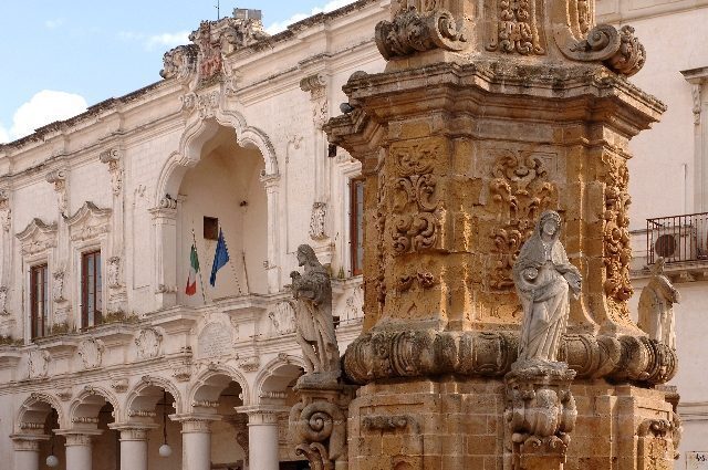 Posizionata al centro della piazza c’è la guglia dell’Immacolata, una colonna alta 19 metri, realizzata in carparo, una pietra locale. In cima spicca la statua bianca della Madonna Immacolata posizionata su un globo terrestre.