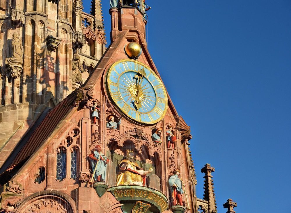 In particolare la Chiesa è conosciuta per lo splendido orologio-carillon che ne adorna la facciata e allo scoccare del mezzogiorno incanta i visitatori con il suo spettacolo in movimento. La fontana è stata costruita a forma di una guglia alta 19 metri e rappresenta la Visione del mondo del Sacro Romano Impero attraverso le sue 40 statue colorate. In realtà quella che si ammira nella piazza è una copia dei primi del 1900 della fontana originale, i cui resti possono essere ammirati all’interno del Museo Nazionale Germanico.