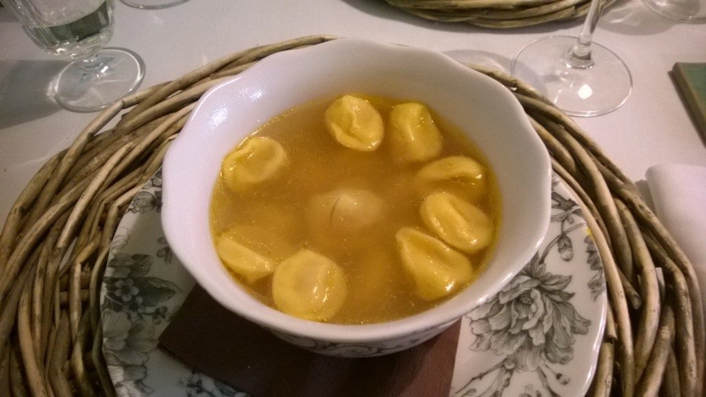 L’osteria non è grande, ma grazie al mobilio, al servizio impeccabile, ci si sente subito a proprio agio. I piatti proposti propongono materie prime tipicamente emiliane come il prosciutto di Parma, cappelletti e piccole particolarità da intenditori. Non è da definirsi un locale low cost, ma cosa importa quando si ha di fronte un piatto di anolini in brodo di una bonta unica? Abbiamo scelto di degustare varie pietanze come i salumi tipici emiliani, un budino di Parmigiano con scalogni glassati e prosciutto di Parma 30 mesi, Millefoglie di Zucca, composta di cipolle di Tropea e formaggio caprino, Anolini in brodo di cappone, un Filetto di cervo (delizioso) con salsa di pere. Effettivamente non ci siamo risparmiati.