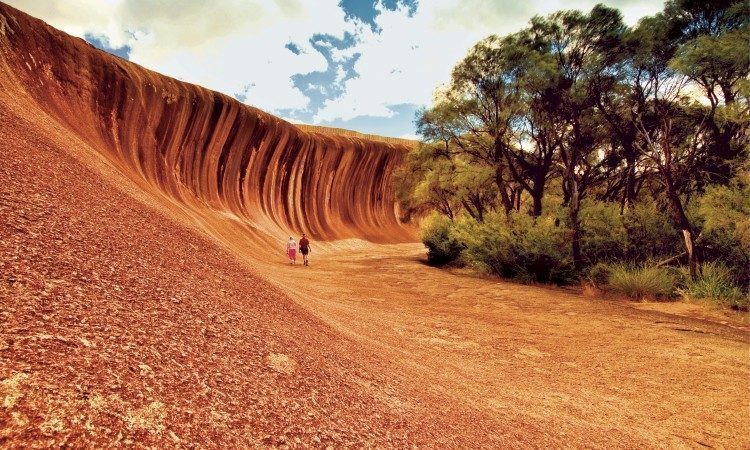 Wave Rock è una formazione rocciosa naturale che assomiglia in tutto e per tutto ad un’onda gigante (altra ben 14 metri e lunga 110) che sta per infrangersi. La roccia è parte della riserva Naturale di Hayden Wildlife Park e si trova vicino alla cittadina di Hyden, a quattro ore di macchina ad est di Perth. Il campeggio più vicino è a pochi minuti a piedi dall’ ”onda” (i prezzi oscillano tra $10 e $25).
