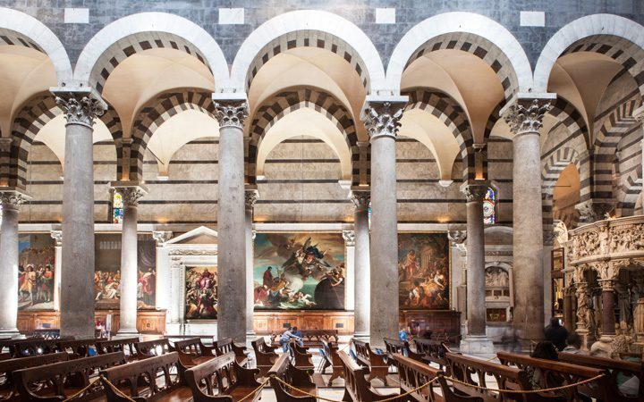 La Cattedrale è il monumento più antico, consacrata nel 1118. All’interno oltre ai marmi ci sono sontuosi affreschi e il prezioso nuovo pulpito (1302-1310) di Giovanni Pisano; se siete invece degli ammiratori di Galileo Galilei in cerca del lampadario che secondo tradizione lo ispirò sull’isocronismo del pendolo, questo non è più in Cattedrale ma nel Campo Santo monumentale.