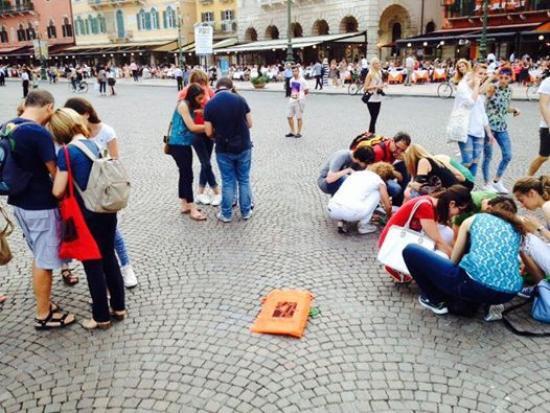 La durata dell’esperienza è di 3-4 ore, in fascia serale, comprensiva di apericena (in questo caso in Piazza Erbe, il salotto cittadino di Verona) e di tutto il materiale necessario. Il costo di 30 €, ben spesi, per un’occasione di scoperta di un sacco di vicende finora solo vagamente conosciute, e che di certo entrano mille volte meglio in testa che dalla lettura di un libro o di una guida “blablabla”.