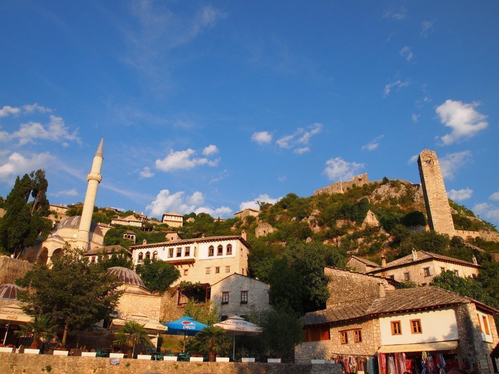 Pocitelj è un piccolo paese, a meno di 30 km da Mostar, che credo sia una tappa “obbligata” per chi sta visitando l’Erzegovina. Ha alle spalle una lunga storia da città fortificata ed ha rivestito un ruolo di grande importanza strategica durante il periodo medievale sotto il dominio ungherese; durante l’occupazione ottomana vennero invece costruiti gli edifici protagonisti della vita pubblica, come le moschee, l’hammam e i bagni turichi, le scuole (Makteb e madresa) e la torre dell’orologio. Ora riusciamo a intravedere però solo una parte della bellezza originaria di questo luogo perché pur essendosi mantenuto quasi intatto fino al secolo scorso, la guerra degli anni ’90 ha fortemente danneggiato molti di questi preziosi edifici.