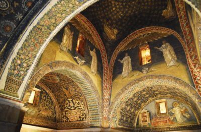 Uscendo dalla Basilica si arriva al Mausoleo di Galla Placidia: sorella dell’imperatore Onorio, trasferì la capitale dell’Impero Romano D’Occidente da Milano a Ravenna. Si fece costruire il mausoleo ma morì e venne seppellita a Roma. La semplicità esterna della costruzione nasconde la ricchezza delle opere musive che si scoprono all’interno. Archi, lunette e cupola sono interamente rivestiti da mosaici.