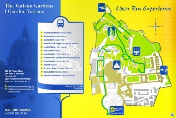 I bus turistici dell’Opera romana pellegrinaggi portano i turisti all’interno dei Giardini Vaticani con un tour di 15 tappe tra la Casina di Pio IV, la Fontana dell’Aquilone, il Torrione S.Giovanni, la Torre Leonina, il roseto e tanti altri.