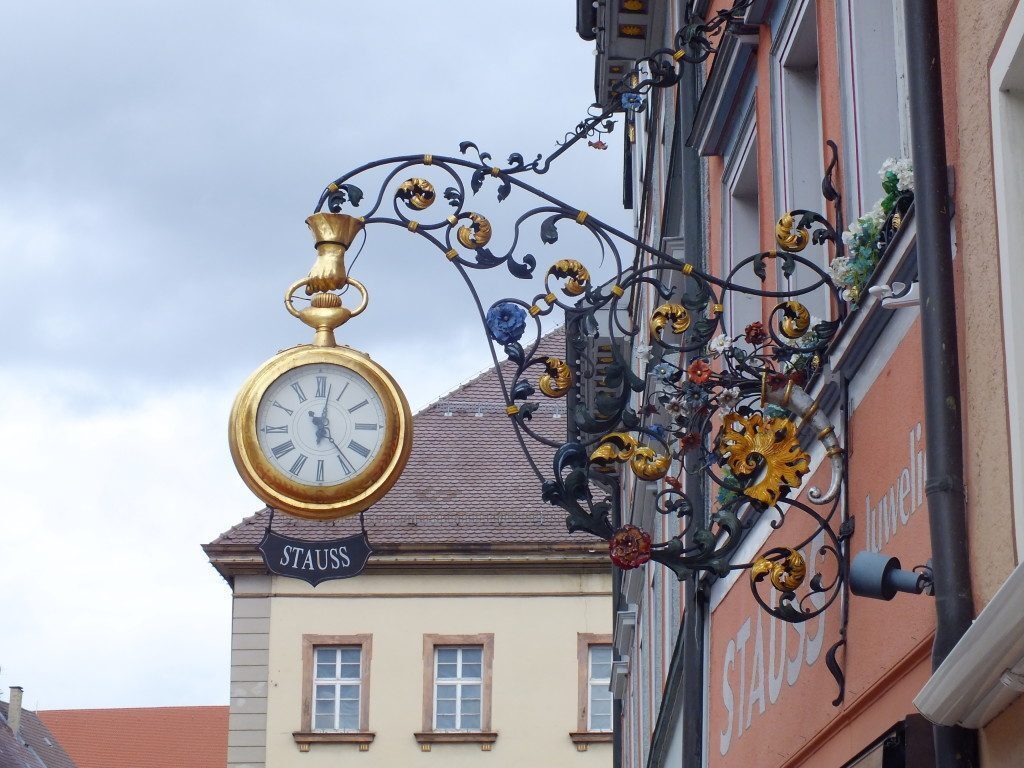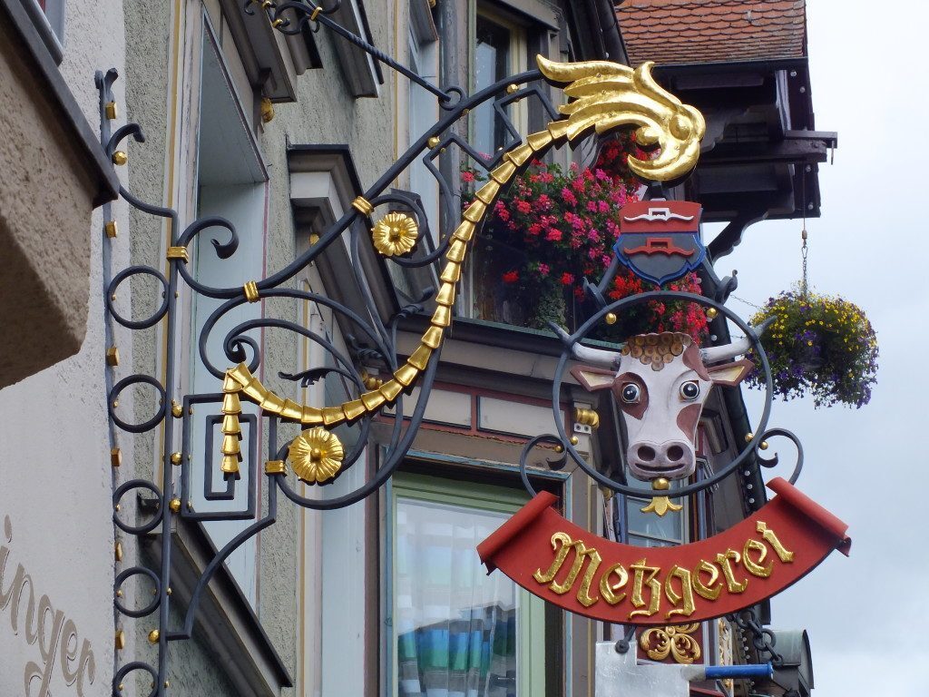 Molte case hanno poi un’insegna di ferro, decorata e colorata. Queste insegne sono tutte “parlanti” illustrano cioé l’attività che si svolge nell’edificio a cui sono affisse. La tradizione delle insegne risale al 16° secolo, quando erano obbligatorie per indicare le osterie, in seguito si differenziarono indicando i mestieri – macellaio, calzolaio, orologiaio ecc Sono molto belle, di ferro lavorato e decorato con cura e a colori vivaci.