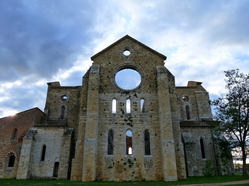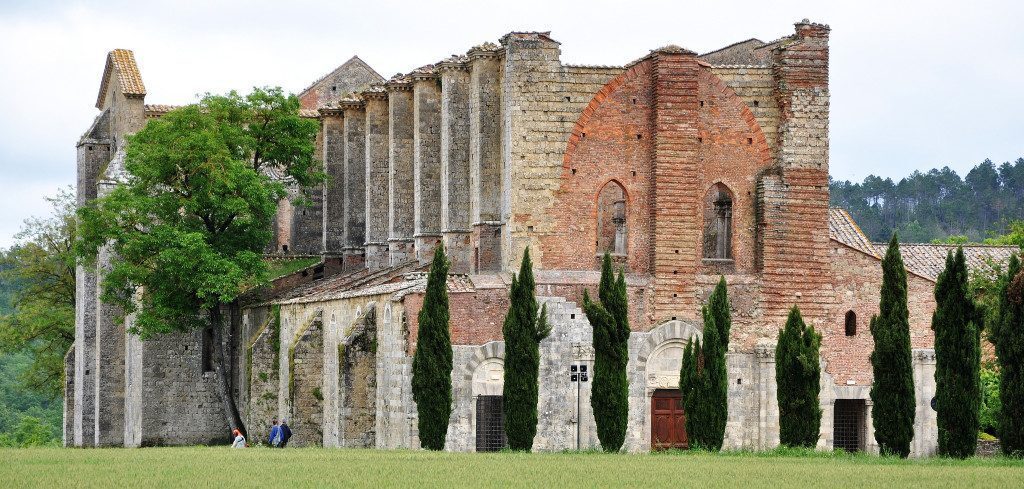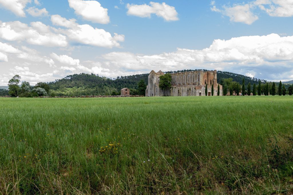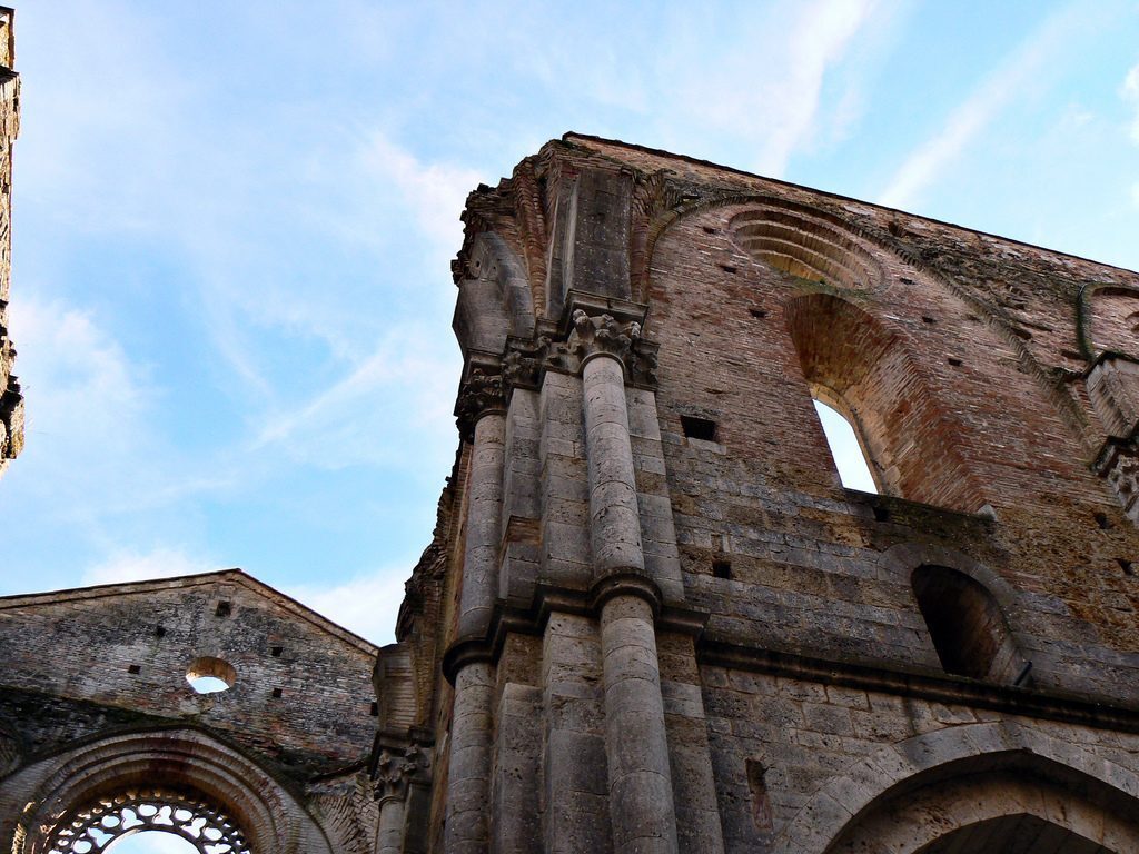 La caratteristica principale dell’Abbazia di San Galgano è quella di essere priva del tetto. La pietra sembra sorreggere il cielo, se vista dall’interno e questo dona al complesso un’aura di magia e suggestione. Intorno il silenzio. Girasoli e viti a perdita d’occhio, terra senese ed ocra brulla. E cipressi che aprono la via verso questa costruzione che sembra aver portato un pezzo di Inghilterra nella nostra terra. L’architettura gotica infatti rimanda alle antiche cattedrali costruite in Gran Bretagna e nei paesi nordici, con tutto il loro fascino ed il loro mistero. E’ davvero molto suggestivo passeggiare lungo la grande navata interna e scoprirne gli angoli, come in un luogo abbandonato ma ancora pieno di storia e di significato, dove le pietre sembrano guardarci e voler raccontare qualcosa.