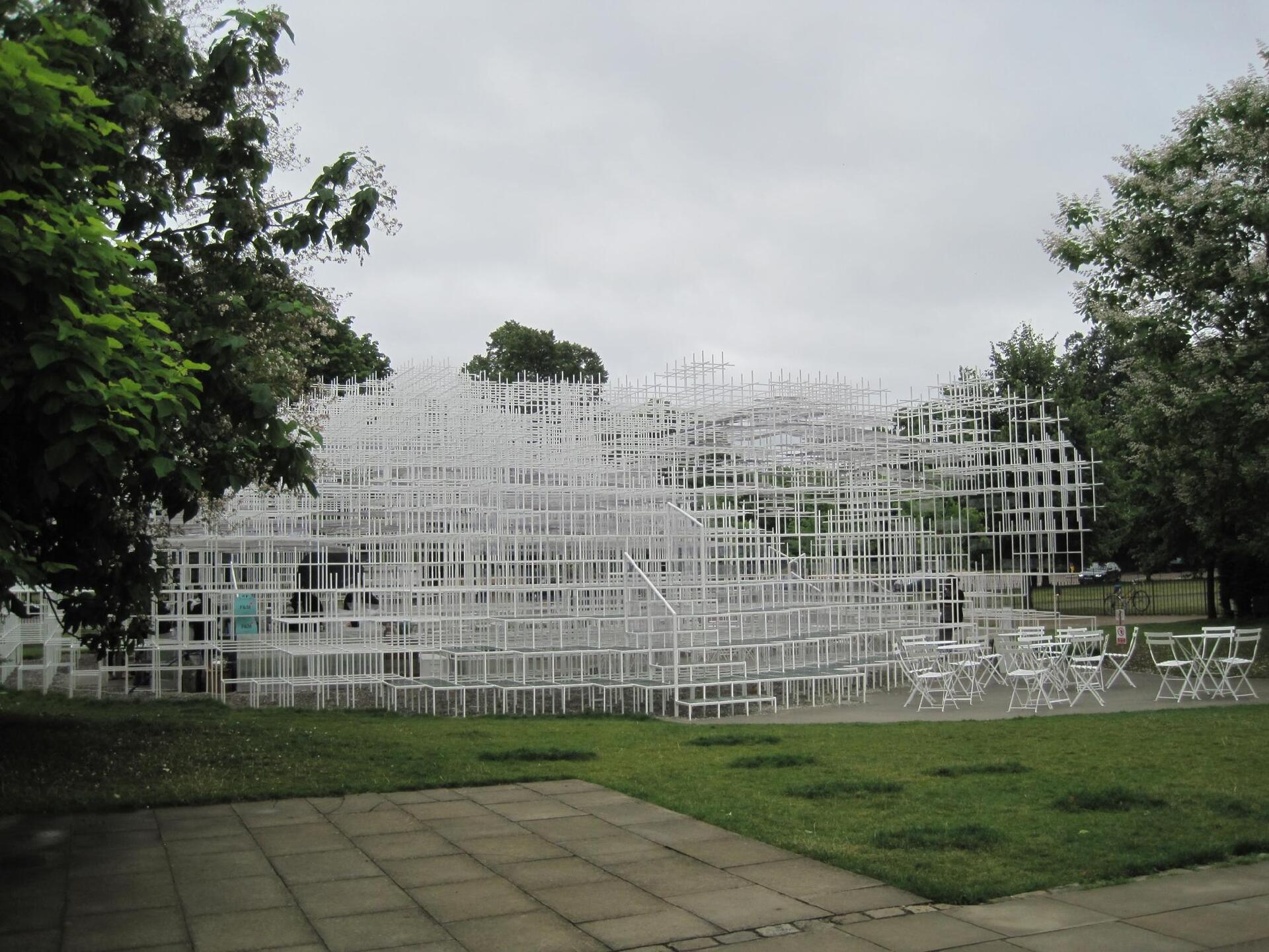 Nel tea pavilion, un edificio in muratura del 1934, vengono esposte opere ed installazioni di artisti contemporanei, ma la parte più interessante è il padiglione temporaneo esterno, che, dal 2000 ad oggi, ha visto la firma dei più importanti archistar mondiali. Quello di quest’anno è stato progettato dall’architetto giapponese Sou Fujimoto e sembra una grande nuvola bianca calata nel verdissimo prato inglese. La struttura, molto semplice, si armonizza con il contesto e sembra fluttuare leggera sul terreno.
