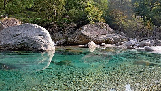 Il fiume Verzasca, che dà il nome all’omonima valle, ha come caratteristica principale il colore delle sue acque e delle rocce su cui scorre. Infatti si creano colori che vanno dal turchese al verde, al blu.