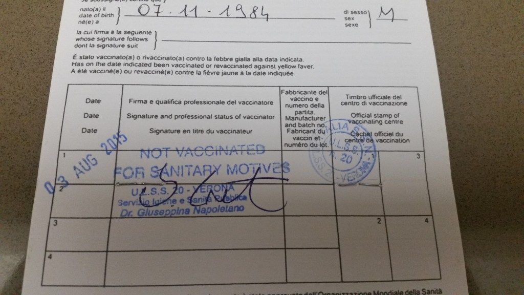 Quindi sono andato al centro viaggiatori internazionali della mia ASL, una visita che caldamente consiglio a tutti prima di andare in mete esotiche. Tagliamo la testa al toro, mi sono detto, perché le opinioni di siti, blog, amici, medici vari, non mi avevano fatto ancora arrivare ad una scelta convinta. Il più delle volte si dice: “beh, falla, non vorrai rischiare”; certo, ok, ma non è la scelta se mettere una maglietta verde piuttosto che rossa, intendiamoci. Alla ASL sono in grado di valutare, anche per maggiore esperienza sul campo, cosa sia meglio fare, in base alle zone visitate, al periodo, all’attività che si svolge, alle condizioni di salute e agli eventuali medicinali che già si assumono per altri motivi.