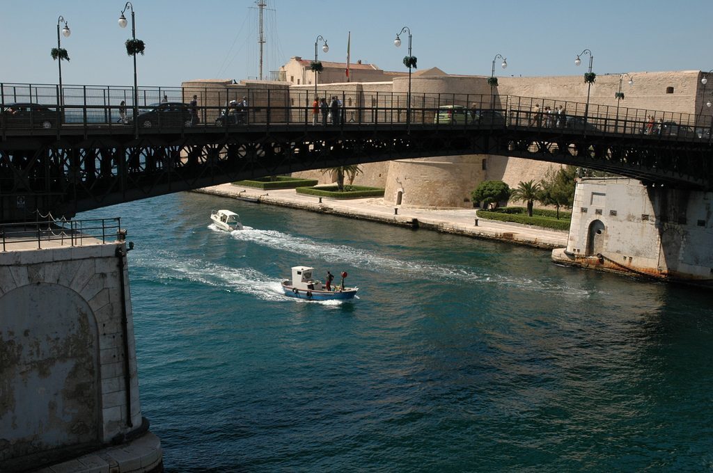 Se ci si reca sul versante di Mar Piccolo, su Via Garibaldi, si incontra poi il frenetico mondo dei pescatori: pesce e mitili freschi tutti i giorni sbarcano dai pescherecci che vi approdano. Qui di sicuro si possono apprendere le prime nozioni del colorito dialetto, ma anche assaporare un po’ di buona cucina locale: io consiglio la Trattoria L’Orologio, così chiamata perché fino a qualche anno fa era sita in Piazza Fontana nell’antico edificio sotto l’orologio, oggi si trova invece in Via Duca D’Aosta, il viale che conduce alla stazione, e offre ottimo cibo, fondamentalmente pesce, ad ottimo prezzo.