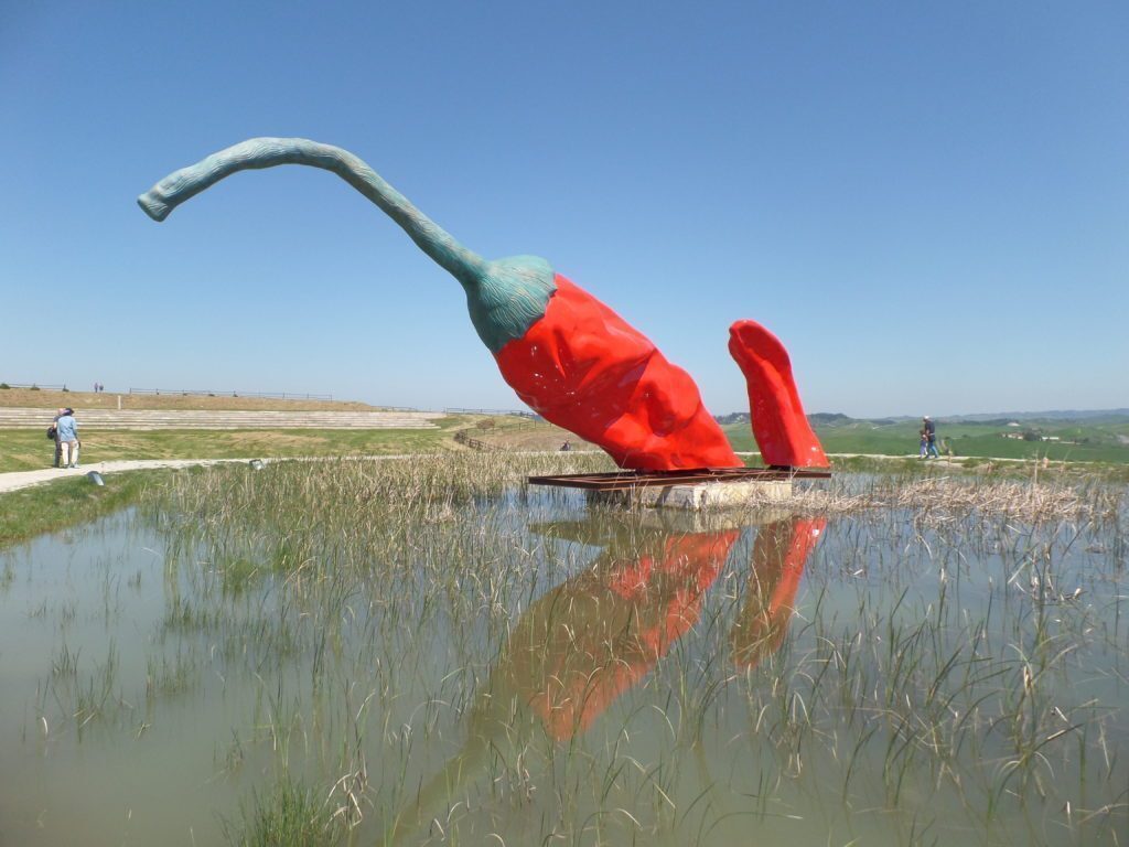 In rete si trovano molte immagini con il mascherone di Igor Mitoraj, ma attualmente la scultura che c’è rappresenta un succulento e molto rosso peperoncino.