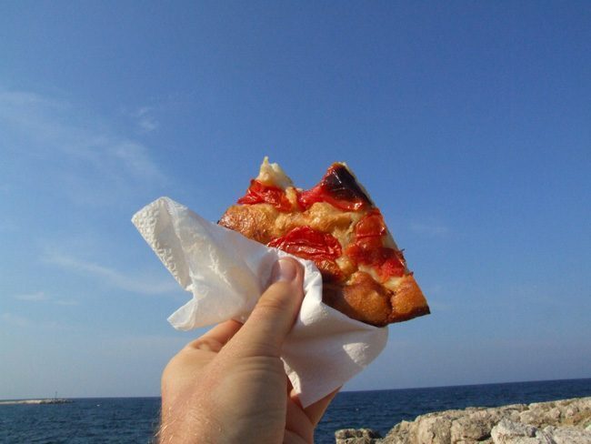 Lasciatemi concludere, quindi, con una delle location più indicate per assaporare il vero “street food” pugliese. Vi do solo parole chiave questa volta: Torre a Mare, porticciolo, fronte-mare, “Cooperativa dei Pescatori”, tavolini in plastica di quelli rossi e marchiati “Peroni”, frittura di pesce, panino col polpo arrostito (!) e…va beh nel nostro caso tanto tanto maestrale.