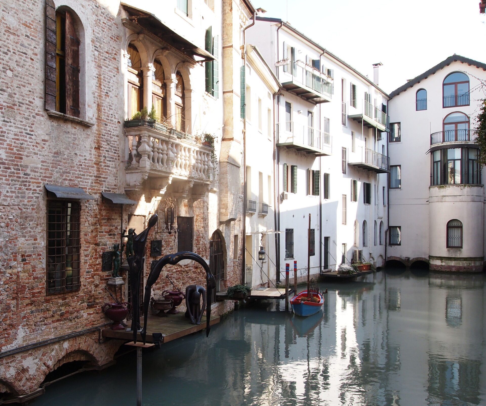 - I canali sono i protagonisti del centro storico, non si è più in Laguna ma il ruolo centrale dell’acqua rimane. Quando meno ce lo si aspetta a metà di una via si trova un ponte o al posto di una piazza uno specchio d’acqua. Treviso è attraversata dal Sile, che si attraversa camminando dalla stazione ferroviaria verso il centro, e lungo il quale si sviluppano passeggiate e giardini dove rilassarsi. Addentrandosi nei vicoli più stretti si possono incrociare i tre canali Roggia (o Siletto), Buranelli e Cagnan Grando. Una delle cose che ho trovato più belle è che in molti punti sono state installate statue ed elementi decorativi per arricchire i già fantastici scorci che si creano tra edifici e corsi d’acqua; il mio preferito è quello che si vede attraversando Ponte della Malvasia.