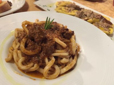 La nostra gita nella Val d’Orcia si conclude con un pranzo divino in una piccola osteria a Montalcino: Re di Macchia. La fame ci faceva affrettare il passo perché ad attenderci ci sarebbero stati crostini tipici, pinci al ragù di cinghiale e cantucci come dolce, il tutto accompagnato meravigliosamente e rigorosamente da vino locale.