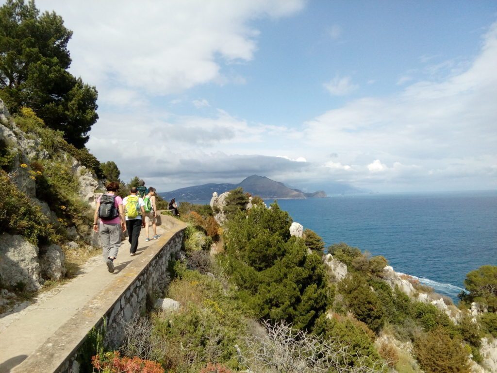 Lo stesso punto si raggiunge da Anacapri con la seggiovia, ma farsela a piedi è un’altra storia. I panorami sono incredibili: Golfo di Napoli, Golfo di Salerno, gli strapiombi mozzafiato. Dopo un tratto in quota, dolcemente si ridiscende ad Anacapri.