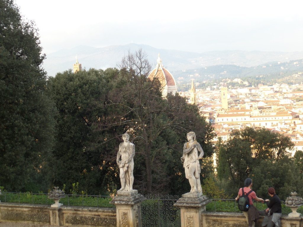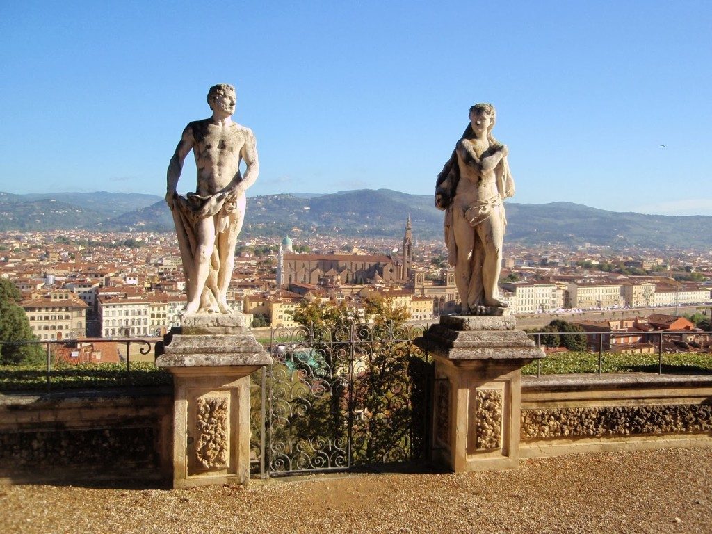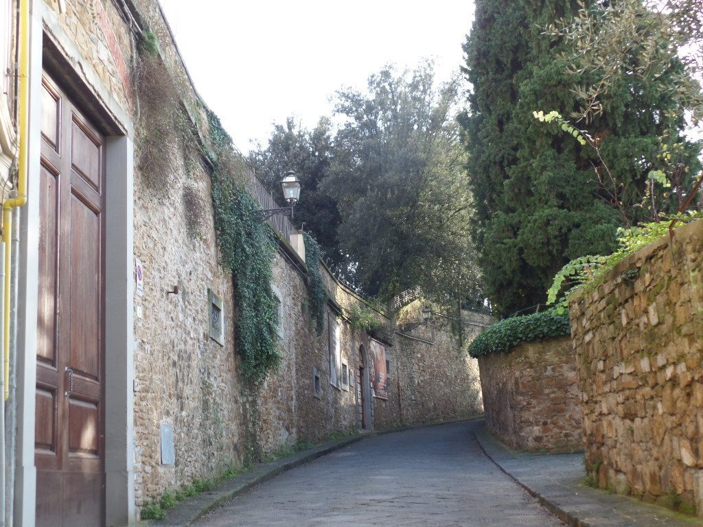 Infatti, scendendo in giardino, dove comunque il panorama non ci abbandona, ci troviamo immersi nella bellezza. Si tratta di un parco insolito, in posizione molto verticale in quanto arrampicato sulla collina, con una parte all’italiana con pratini, aiuole, statue e una parte più romantica o all’inglese molto boscosa che confina con la Porta a San Giorgio, oltre alla quale c’è l’omonimo forte meglio conosciuto come Forte Belvedere.